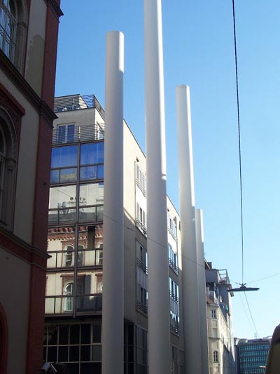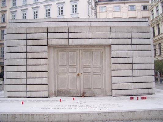 Насилие по отношение к евреям достигло пика в ноябре 1938. Во время т.н. «Хрустальной ночи» (9-10 ноября 1938 г.) были сожжены 42 венские синагоги. Среди разрушенных в ту ночь синагог была синагога Леопольдштадта, Леопольдштадский Городской Храм, на месте которой сейчас установлен вот такой странный монумент