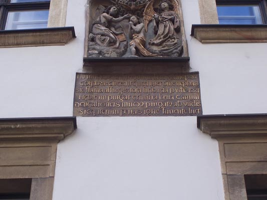 Латинская надпись под рельефом гласит: «Потоки Иордана смывают с тел грязь и зло. Все что скрыто и грешно исчезает. Также и в 1421 г. поднялось пламя ненависти, пылало по всему городу и искупило ужасные преступления еврейских собак. Как когда-то мир был очищен всемирным потопом, так и теперь все грехи были искуплены пылающим огнем».